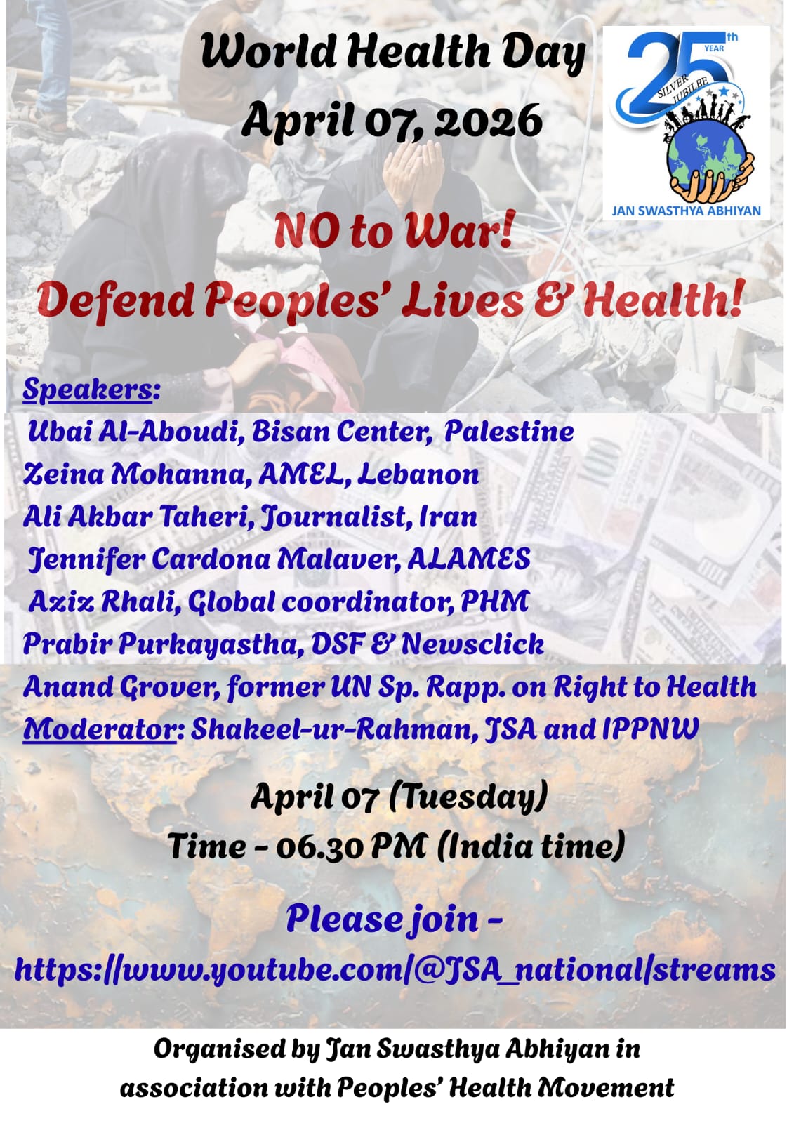 During this webinar we will hear about the ongoing crisis and health impacts due to military aggression especially in Palestine, Lebanon and Cuba and Iran. We aim to foreground multiple voices of resistance and solidarity from across the globe, asserting the primacy of people’s health and peace over militarism and imperialist aggression.