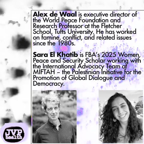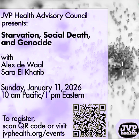The People's Health Movement and Jewish Voice for Peace Health Advisory Council invite you to a new webinar series on the situation in Palestine: Starvation, Social Death, and Genocide featuring Alex de Waal and Sara El Khatib.